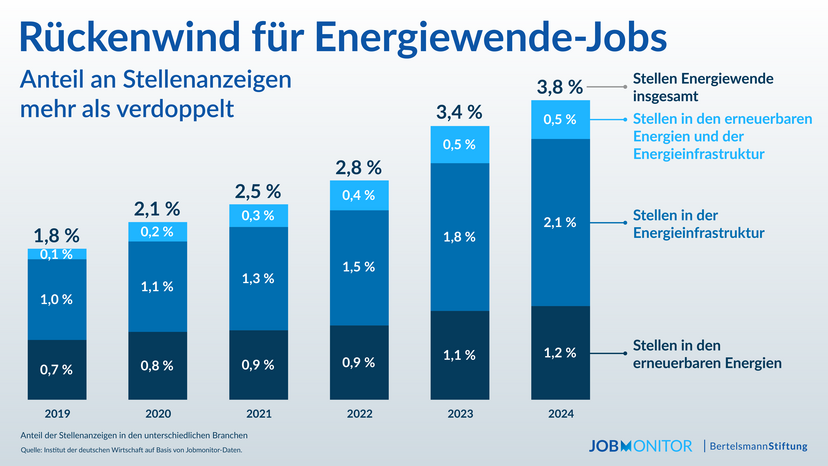 Jobs related to renewable energies and associated infrastructure currently account for around 4% of the 10 million jobs nationwide. In addition, while the total number of job vacancies in Germany declined by 16% last year, the energy transition sector only saw an 8% drop.