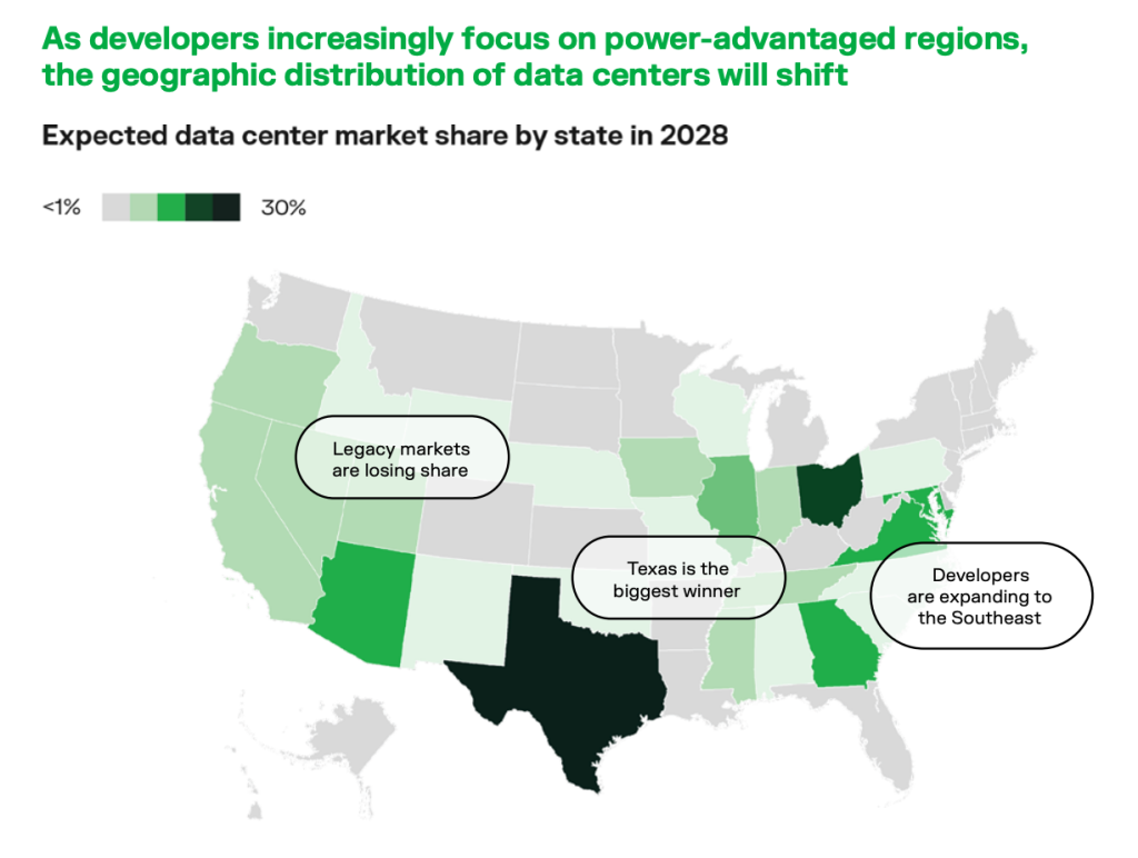 This, in turn, is influencing the geographical spread of data centres, with increased focus on power-advantaged regions – Texas, which is expected to capture around 30% of US data centre market share by 2028, is the big winner, while Georgia’s share is expected to almost double, from 4% of the total data centre market, to 7%.