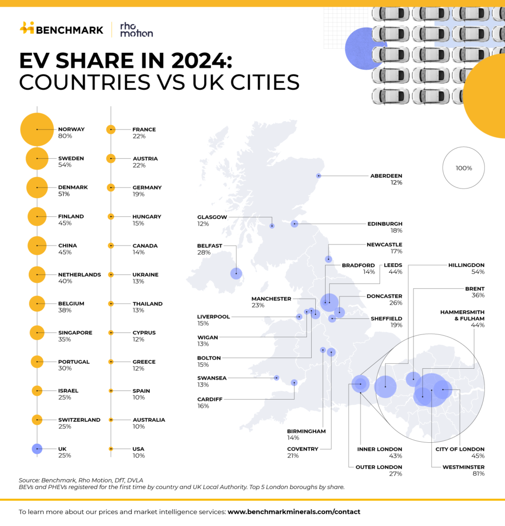 The UK’s electric vehicle (EV) penetration rate reached 25% of all new passenger car and light-duty vehicle sales last year, according to new data from Rho Motion.
