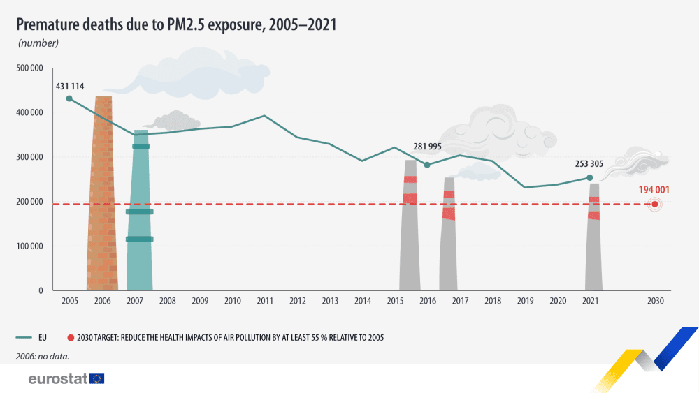 In 2021, the EU reported 253,305 premature deaths as a result of air pollution, which was a decrease of 10.2% compared to 2016, and 41% compared to 2005.