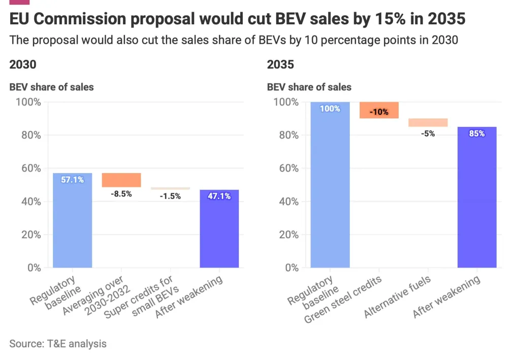 The weakening of the European Commission’s car emissions regulations will likely reduce the share of battery electric vehicles by 15% by 2035, Transport & Environment (T&E) has said.